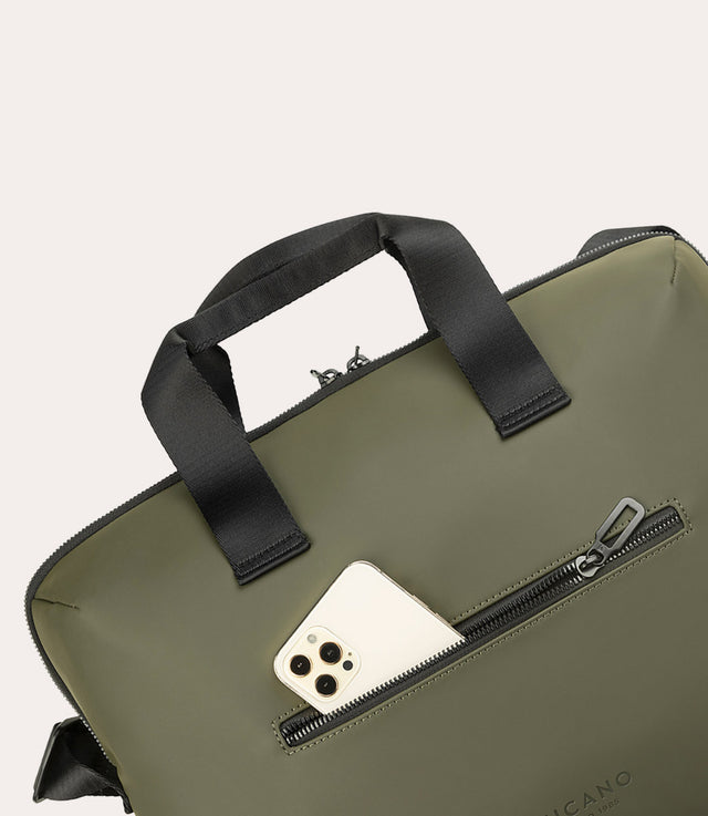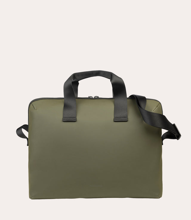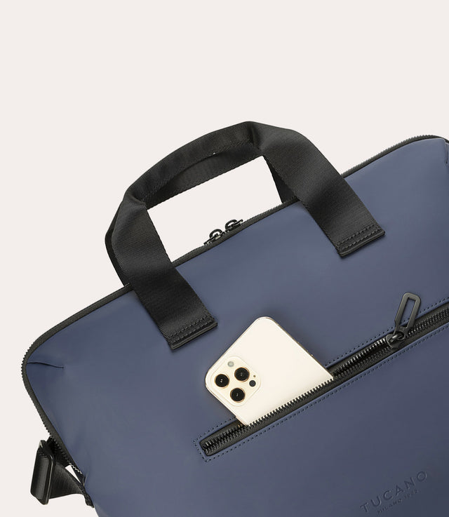 Minimal-sporty design bag for 15.6" laptop and 16" MacBook, made of rubberized material. Features a large single compartment with an interior laptop pocket and an exterior accessory pocket.