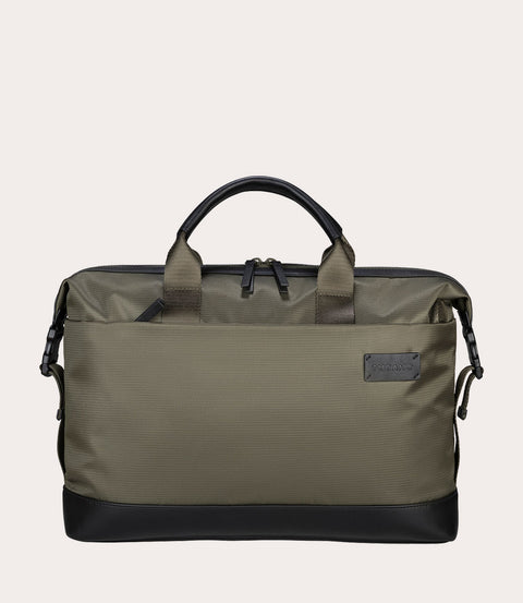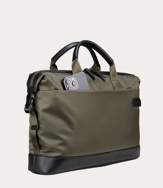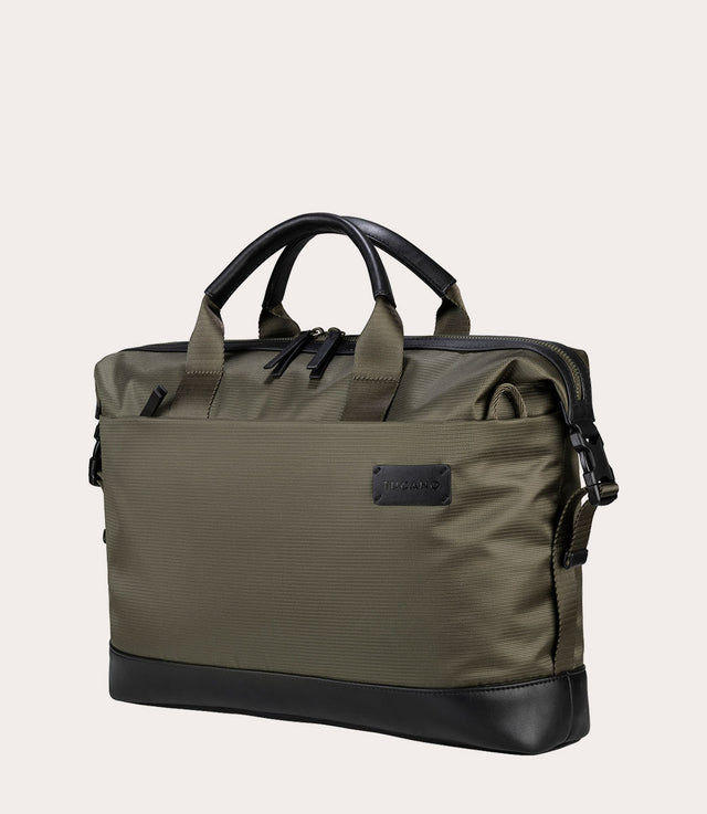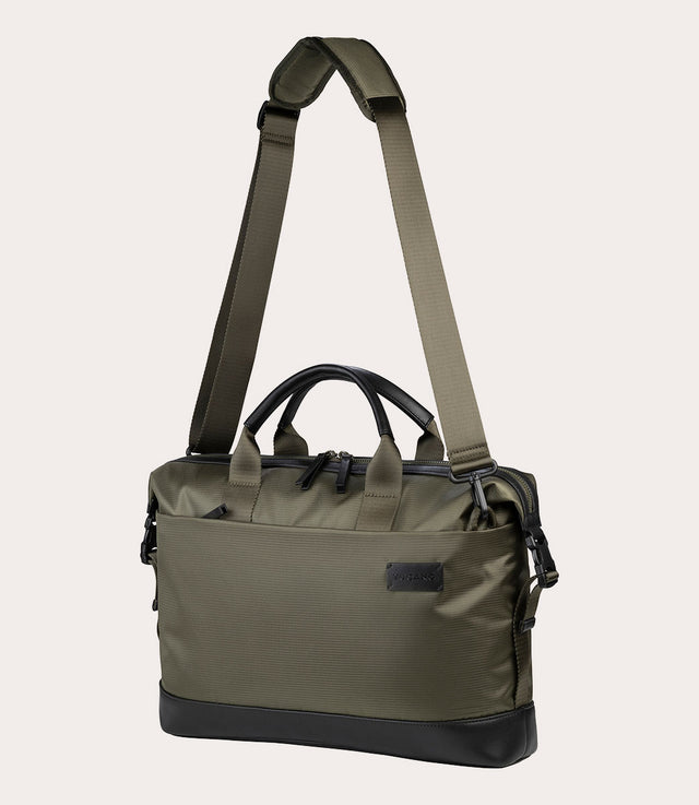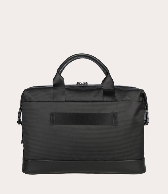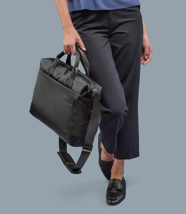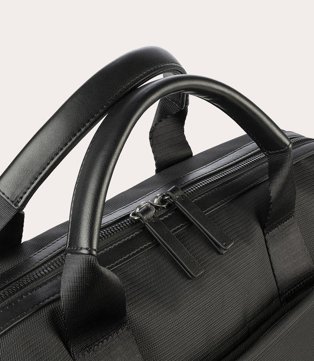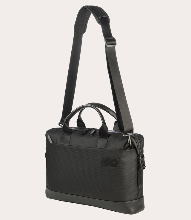 Business bag made of fabric produced from recycled plastic features leather accents and an internal compartment with a double protective pocket for 15.6" laptops or 16" MacBooks. With its ample, easy-access top opening, which can be adjusted from either end using the side straps, the Modo Premium bag features two external pockets for accessories and a trolley strap. Removable shoulder strap.