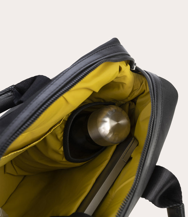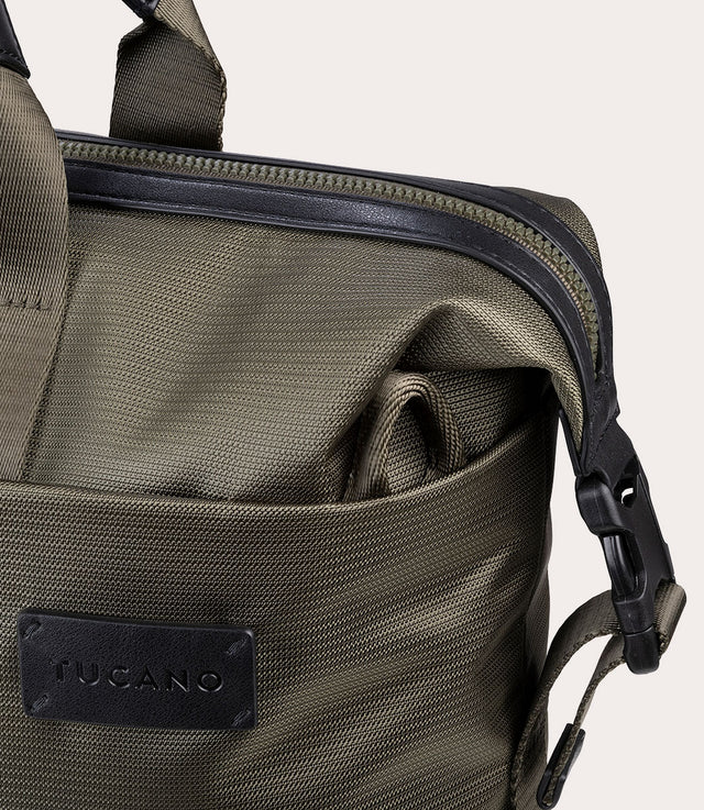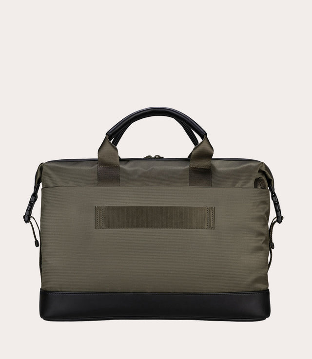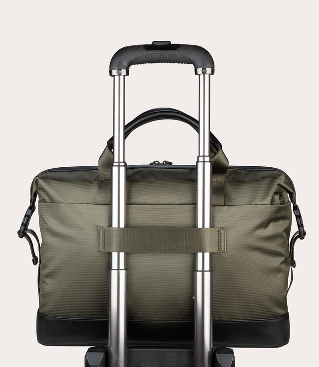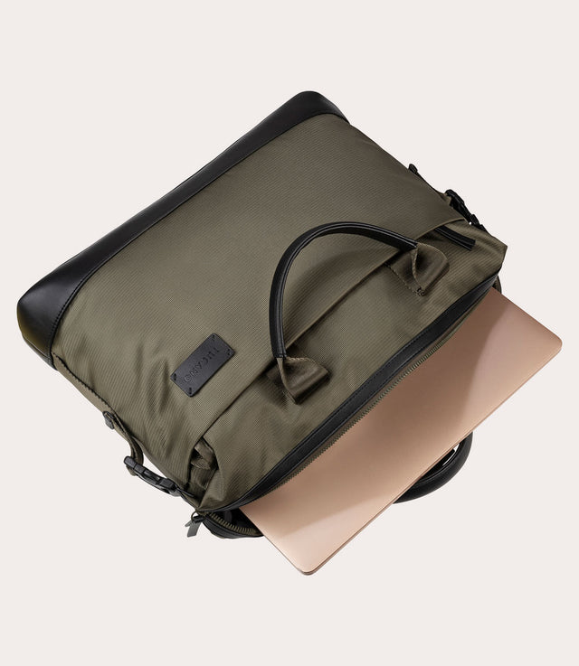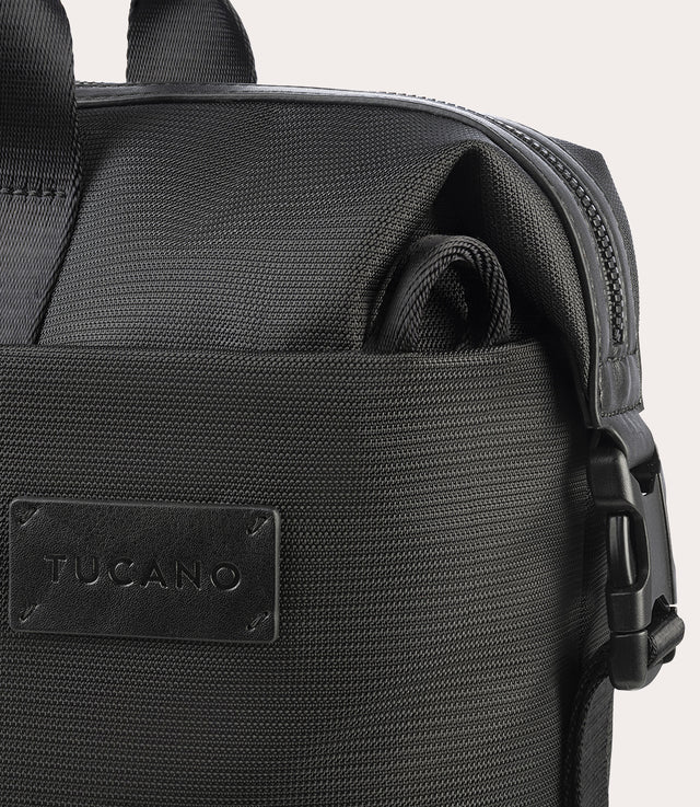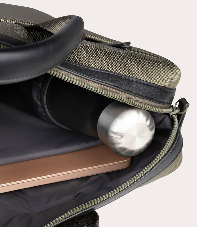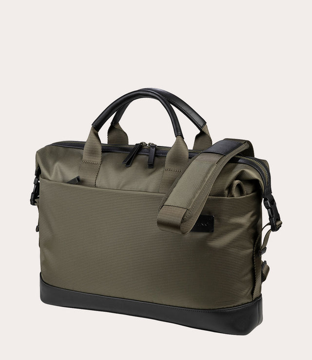 Business bag made of fabric produced from recycled plastic features leather accents and an internal compartment with a double protective pocket for 15.6" laptops or 16" MacBooks. With its ample, easy-access top opening, which can be adjusted from either end using the side straps, the Modo Premium bag features two external pockets for accessories and a trolley strap. Removable shoulder strap.