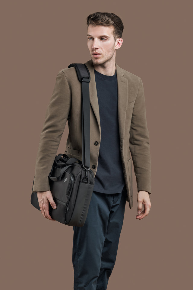 Bolsa con estilo moderno para ordenador portátil 15.6 pulgadas y MacBook Pro 16 pulgadas fabricada con tejido obtenido a partir de plástico reciclado. Dos compartimentos interiores con cremalleras separadas, equipados con un compartimento protector para el PC y la tableta. Dos bolsillos frontales externos la hacen especialmente espaciosa. Los cordones están adornados con un estampado integral tono sobre tono. Correa de hombro ajustable y desmontable.