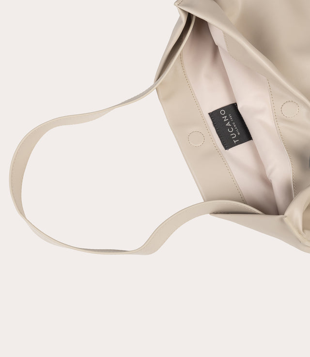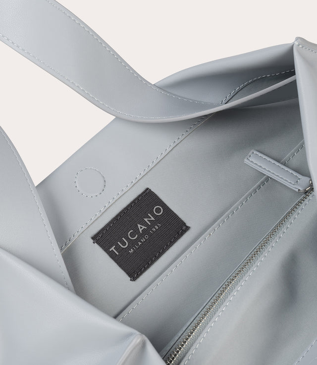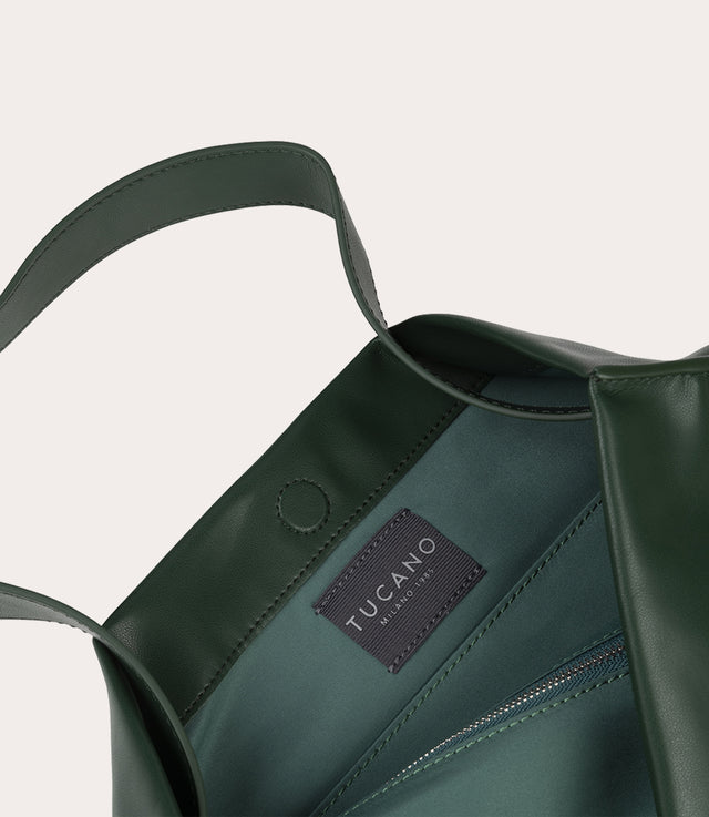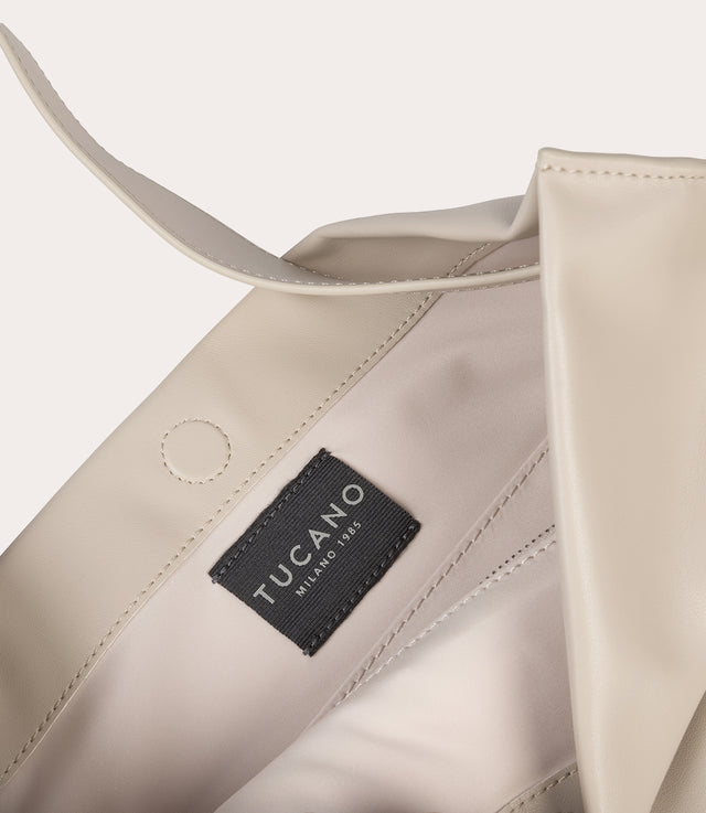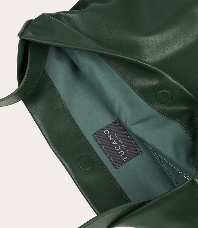 Descrizione: Pelle sintetica con supporto in poliestere riciclato e fodera in plastica riciclata