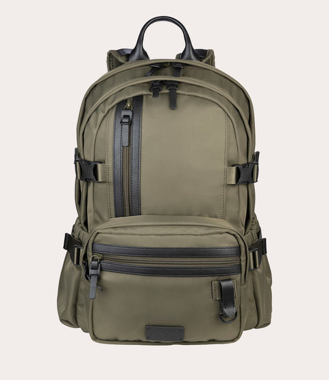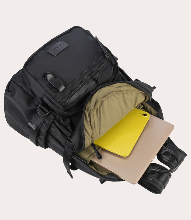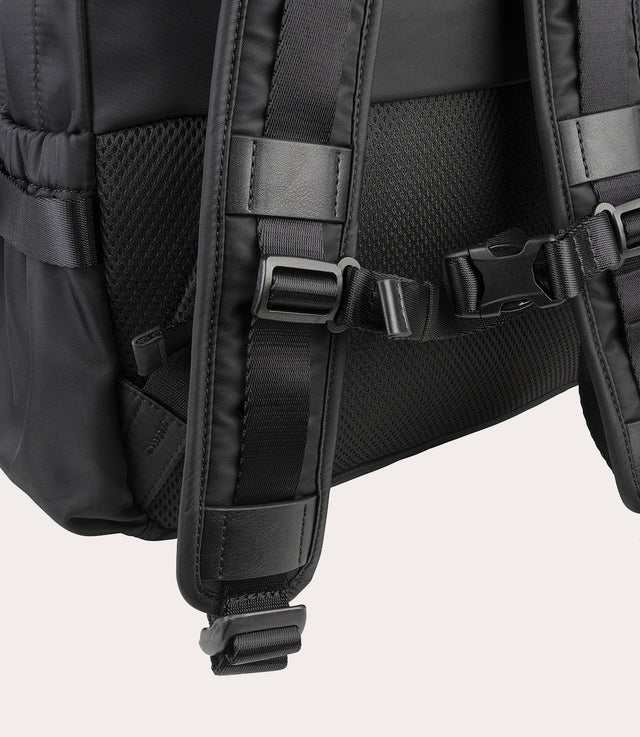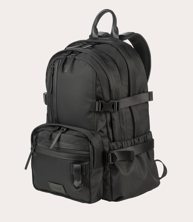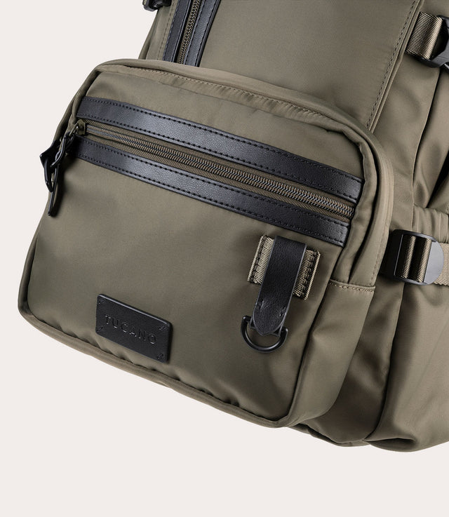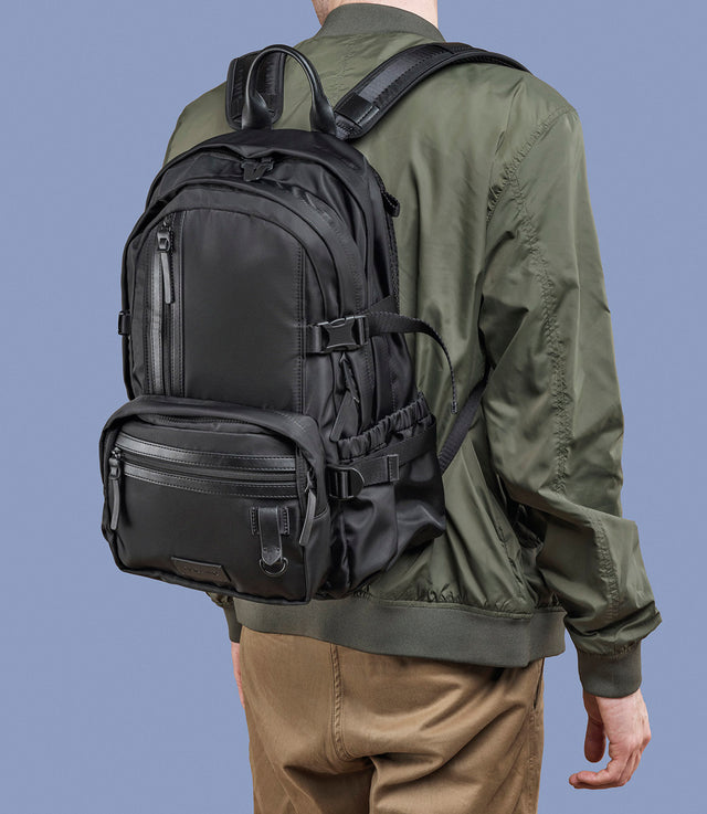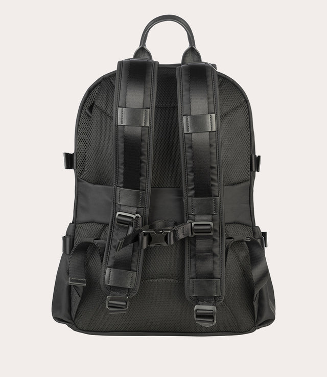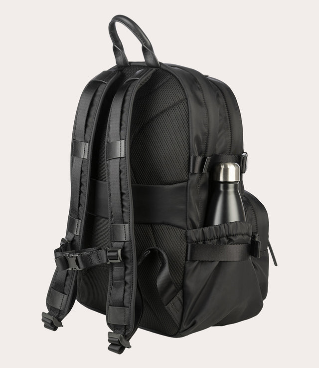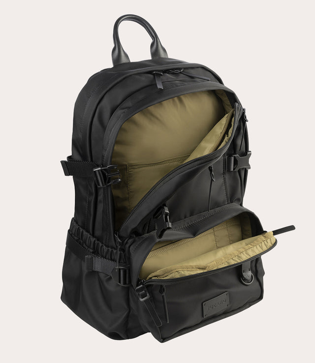 • Zaino in tessuto ottenuto dalla plastica riciclata e dettagli in pelle
