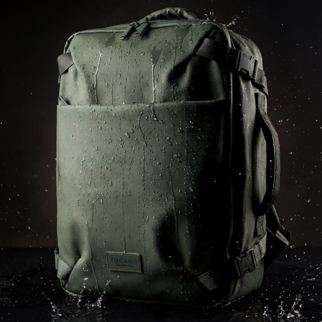 Il tessuto tecnico impermeabile, ricavato da plastica riciclata, e le cerniere protette creano una barriera efficace contro pioggia e umidità. Dispositivi e abiti restano asciutti, dal gate all'hotel.