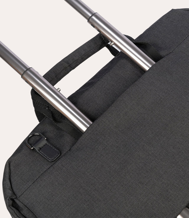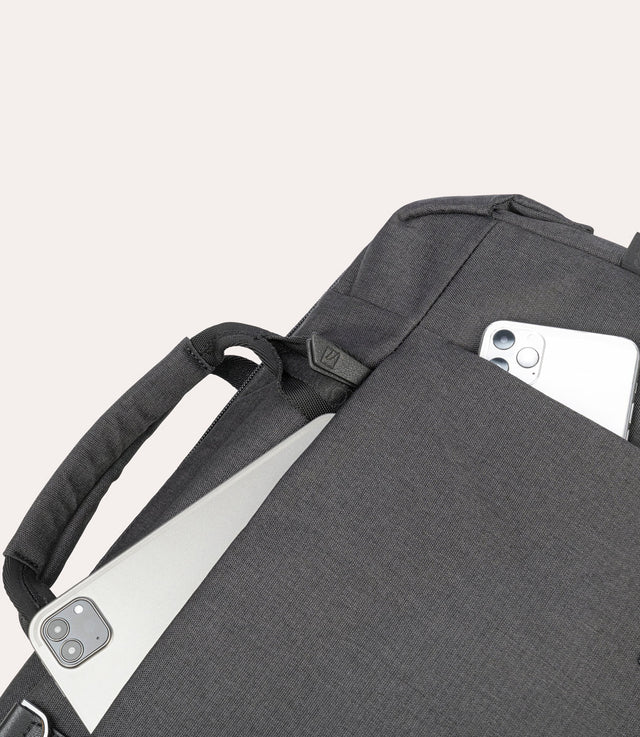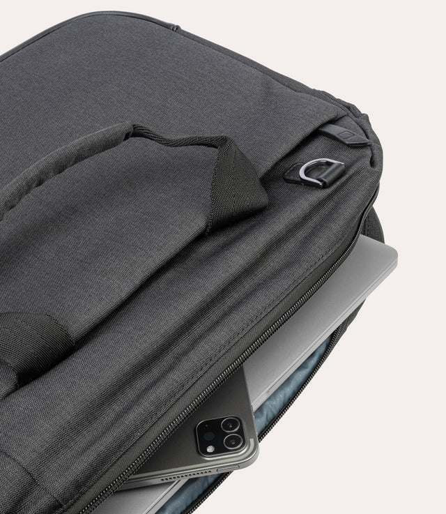 Borsa business per laptop 15.6" e MacBook 16", realizzata in tessuto mélange ricavato dalla plastica riciclata. Leggera e dal design squadrato, la borsa Ago è dotata di un ampio vano interno, di una doppia tasca per laptop e per tablet e di una perfetta organizzazione delle tasche. La tracolla è regolabile e rimovibile.