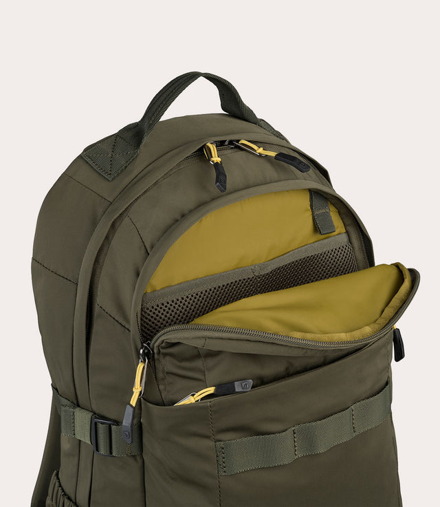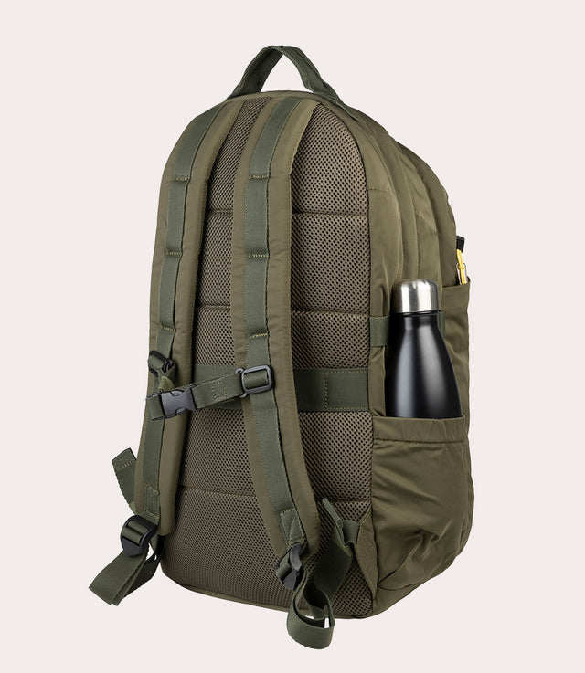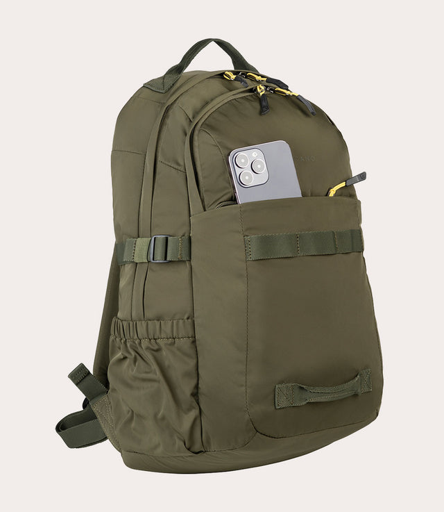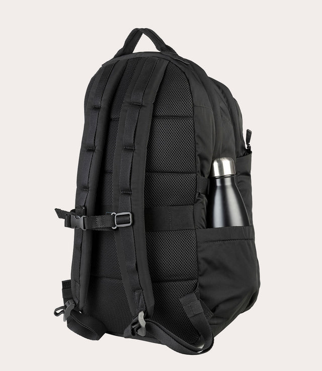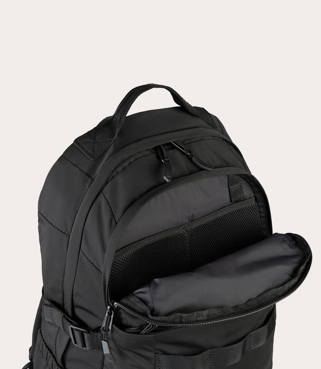 Volumi ampi e linee sportive per lo zaino Band realizzato in materiale ottenuto dalla plastica riciclata e caratterizzato da applicazioni in nastro sul pannello frontale. Dotato di tasca imbottita per laptop 15.6” e MacBook 16”, di un doppio vano separato da zip e di due comode tasche frontali per accessori. lo zaino Band offre un’ottima organizzazione.