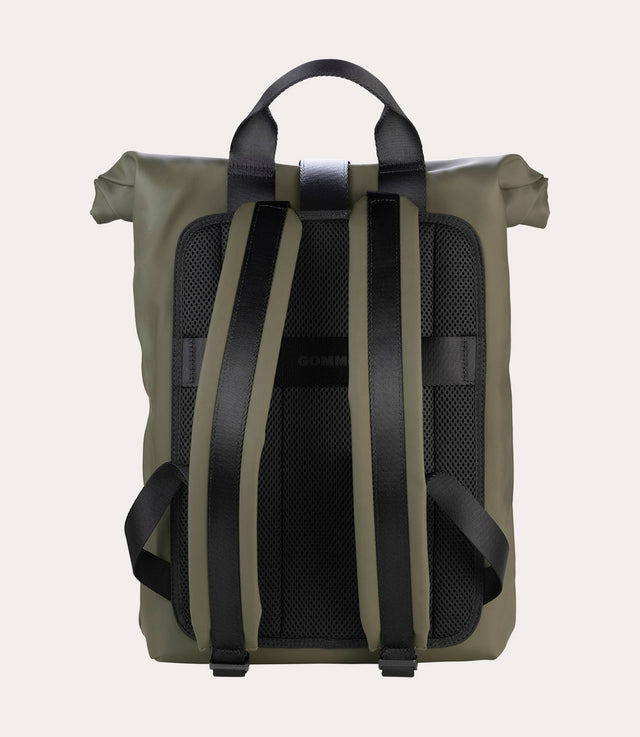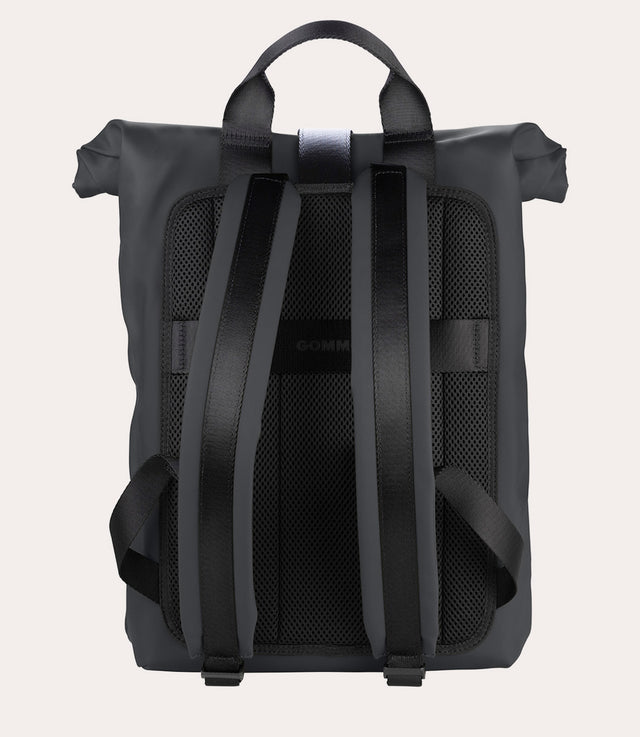 Zaino con chiusura arrotolabile per laptop 15.6" e MacBook 16", in materiale gommato water resistant ottenuto dalla plastica riciclata. Dotato di un ampio vano unico, lo zaino Gommo roll top ha una tasca interna per il laptop, una tasca esterna per accessori e uno schienale in rete traspirante con la fascia per il trolley applicata.