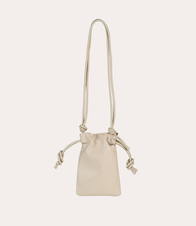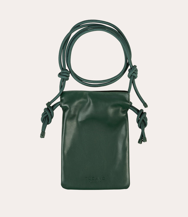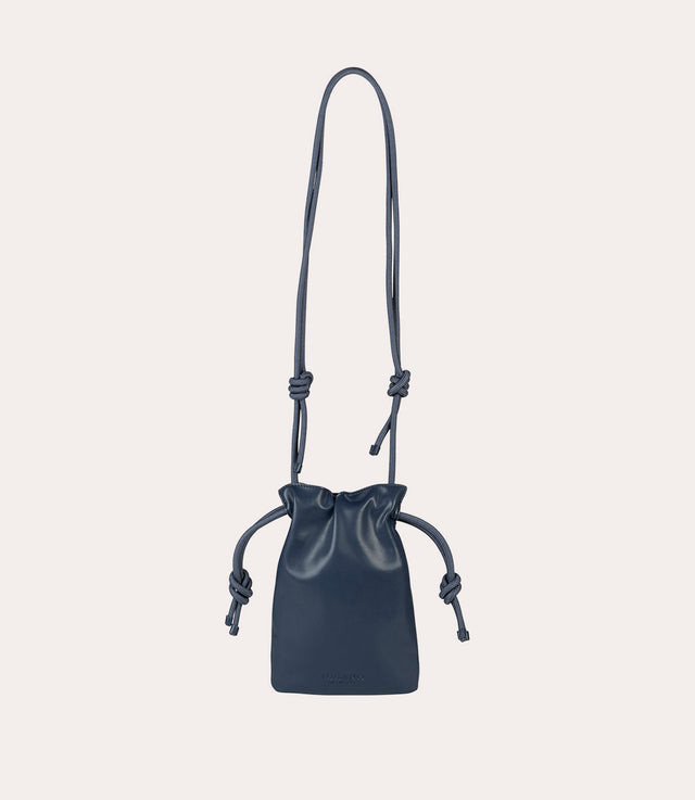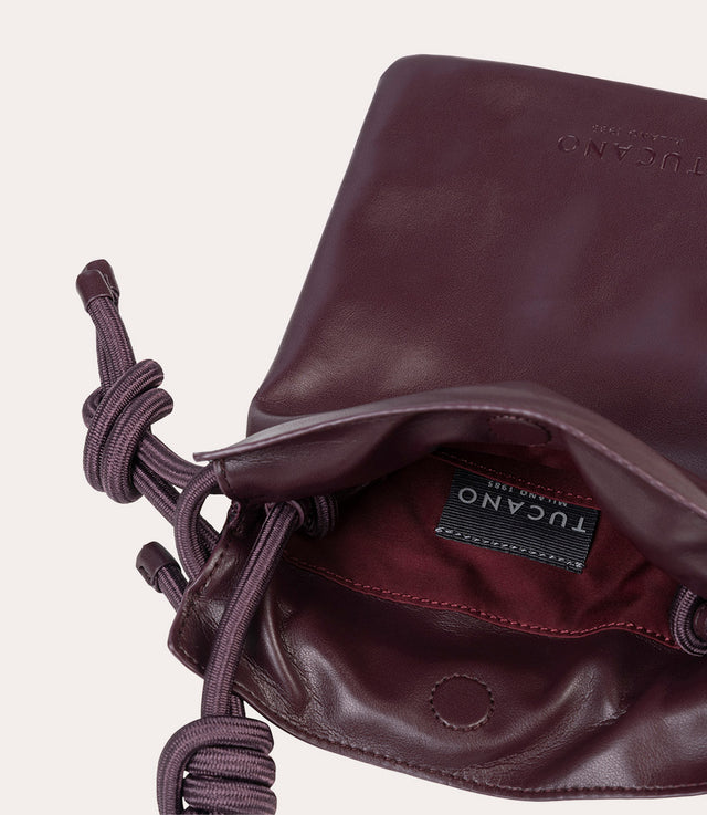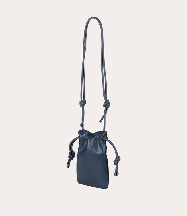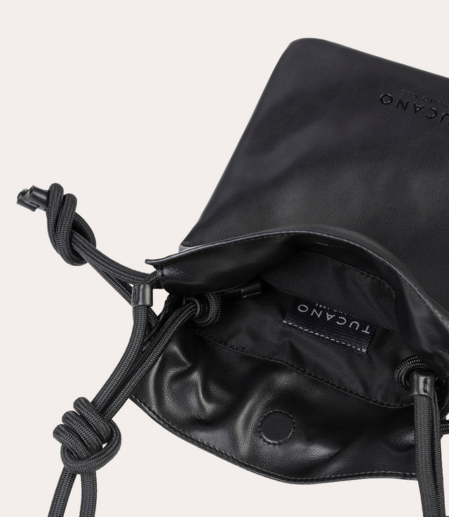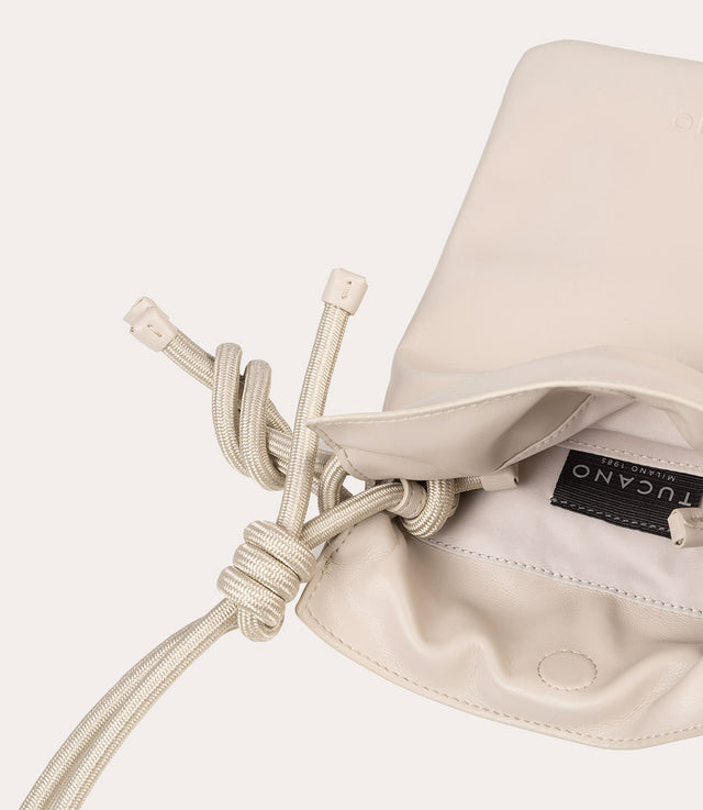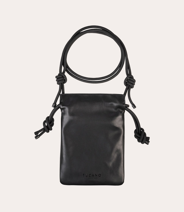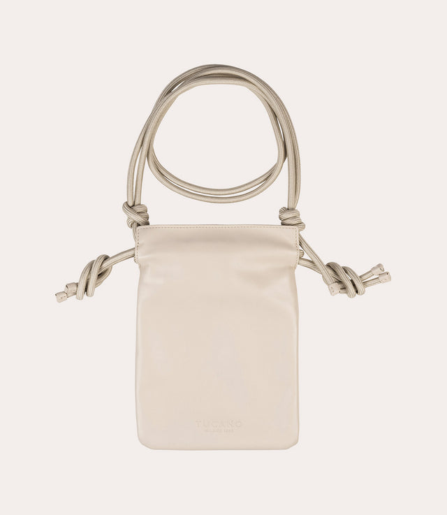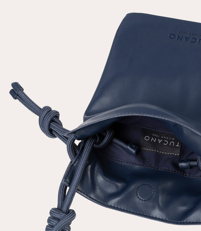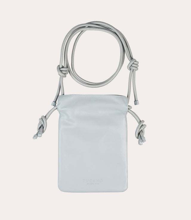 Mini bag con chiusura a strozzo in morbida pelle sintetica, ottenuta dalla plastica riciclata. Disegnata per contenere il celluare e altri accessori, la mini bag Nina ha il lato posteriore schermato da un tessuto antiradiation, in grado di proteggere dalle onde elettromagnetiche. Nina è dotata di cordino in tessuto regolabile. Chiusura con bottone magnetico.